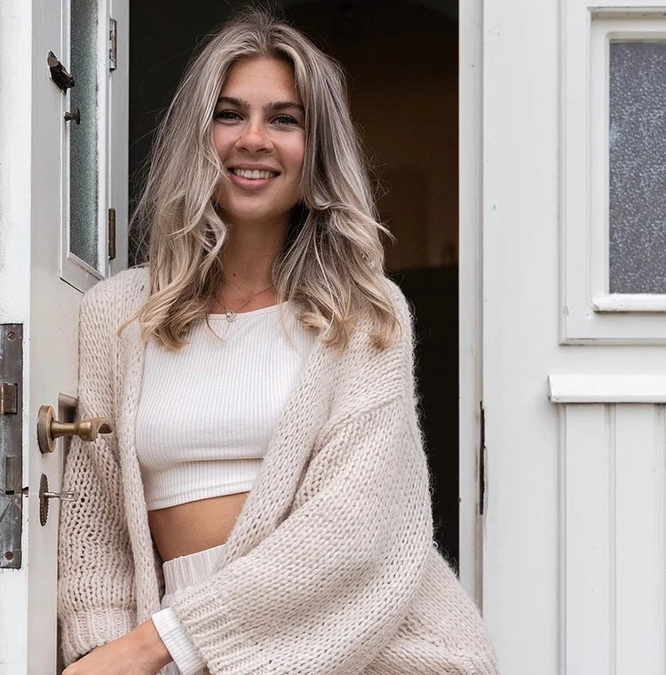 "Att andas är otroligt effektivt. Som andningsterapeut tror jag starkt på kraften i andningen. AIKI-kedjan är min fasta punkt, min påminnelse om att återvända till mig själv. 4 sekunders inandning genom näsan ner till magen, och sedan en långsam utandning genom kedjan. Magiskt! Jag anser att AIKI är det mest geniala smyckesmärket i vår tid. I en tid då stress- och utbrändhetsbesvär blir alltmer